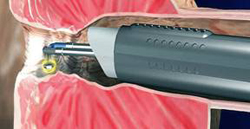 The loop or grooved bar electrode is attached to a continuous flow resectoscope. In electrosurgical vaporization, the VaporTrode rapidly heats the tissue cells so that they essentially turn into steam, thus leaving a space where the obstructing tissue resided. The bulk of the heat is changed into steam and which is washed away via the continuous flow from the resectoscope. As the electrode moves to a new area, more cells are similarly removed thus creating a space and removing the obstructing tissue. Additionally, any larger tissue debris is also washed away by the constant irrigation through the resectoscope.
